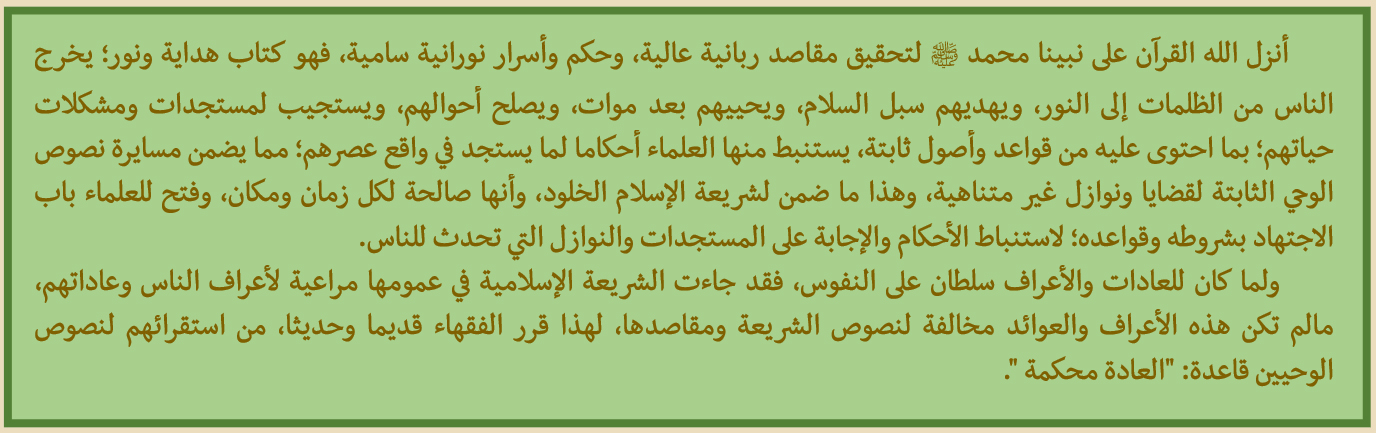 مقدمة وهذه القاعدة من القواعد الكبرى، التي اعتمد عليها العلماء في كثير من المسائل، وهي تفيد أن العادة تعتبر مرجعا شرعيا في إثبات الأحكام الشرعية، لأنها دليل يُبنى عليه الحكم الشرعي، يعني أن العادة عامة كانت أو خاصة، تُجعل حَكماً لإثبات حكم شرعي لم ينص على خلافه، فلو لم يرد نص يخالفها أصلًا، أو ورد ولكن كان عاما، فإن العادة تعتبر حينئذ محكمة. أولا: الأدلة التي تنبني عليها القاعدة: 1) العادة لغة واصطلاحا العادة في اللغة: الدَّيْدَنُ يُعادُ إِلـيه، وجمعها عادٌ وعاداتٌ. وتعَوَّد الشيءَ وعادَه وعَاوَدَه مُعاوَدَةً وعِواداً واعتادَه واستعاده وأَعادَه أَي صار عادَةً له[1]. وفي الاصطلاح الشرعي العادة: هي الاستمرار على شيء مقبول للطبع السليم، والمعاودة إليه مرة بعد أخرى. وهي المرادة بالعرف العملي. فالمراد بها حينئذ ما لا يكون مغايراً لما عليه أهل الدين والعقل المستقيم ولا منكراً في نظرهم[2]. قال ابن نجيم رحمه الله: (واعلم أن اعتبار العادة والعرف يرجع إليه في مسائل كثيرة، حتى جعلوا ذلك أصلا، فقالوا في باب الأصول ـ في باب ما تترك به الحقيقة -: تُترك الحقيقة بدلالة الاستعمال والعادة. وذكر السراج الهندي في “شرح المغني”: العادة عبارة عما يستقر في النفوس من الأمور المتكررة المقبولة عن الطباع السليمة. وهي أنواع ثلاثة: العرفية العامة، كوضع القدم[3]، والعرفية الخاصة[4]، كاصطلاح كل طائفة مخصوصة، كالرفع للنحاة، والفرق والجمع والنقض للنُظار، والعرفية الشرعية[5]، الصلاة والزكاة والجح، وتُركت معانيها اللغوية بمعانيها الشرعية[6]. 2) أصل قاعدة العادة محكمة وأصل هذه القاعدة قول عبد الله بن مسعود رضي الله عنه: “ما رآه المسلمون حسنا فهو عند الله حسن، وما رآه المسلمون قبيحا فهو عند الله قبيح”[7]. ويدل كذلك على صحة الرجوع إلى العرف والعادة فيما لا يخالف الشرع قول الله تعالى: ]خُذِ اِ۬لْعَفْوَۖ وَامُرْ بِالْعُرْفِۖ[ الأعراف 199. وقوله تعالى: ]وَءَاتُوهُنَّ أُجُورَهُنَّ بِالْمَعْرُوفِ مُحْصَنَٰتٍ غَيْرَ مُسَٰفِحَٰتٖ[ النساء: 25، وقال تعالى: ]وَعَاشِرُوهُنَّ بِالْمَعْرُوفِۖ[، النساء : 19، قال الإمام القرطبي رحمه الله: “العرف والمعروف والعارف: كل خصلة حسنة ترتضيها العقول وتطمئن إليها النفوس”[8]. وكذلك ما جاء في قوله تعالى: ]لَا يُوَ۬اخِذُكُمُ اُ۬للَّهُ بِاللَّغْوِ فِےٓ أَيْمَٰنِكُمْۖ وَلَٰكِنْ يُّوَ۬اخِذُكُم بِمَا عَقَّدتُّمُ اُ۬لَايْمَٰنَۖ فَكَفَّٰرَتُهُۥٓ إِطْعَامُ عَشَرَةِ مَسَٰكِينَ مِنَ اَوْسَطِ مَا تُطْعِمُونَ أَهْلِيكُمُۥٓ أَوْ كِسْوَتُهُمُۥٓ أَوْ تَحْرِيرُ رَقَبَةٖۖ[المائد: 91، فقوله ] مِنَ اَوْسَطِ مَا تُطْعِمُونَ[ يقرر لنا الضابط الذي يلجأ إليه في تحديد مقدار الطعام، وتوفير الكسوة في جميع الأحكام المتعلقة بالكفارات، التي لم ينص الشرع فيها على مقدار معلوم معين، فينظر فيها إلى الأعراف السائدة والعوائد المُتبعة، وتُفصل القضايا حسب مُقتضاها[9]. وعن عائشة رضي الله عنها: (أن هند بنت عتبة قالت: يا رسول الله، إن أبا سفيان رجل شحيح، وليس يعطيني ما يكفيني وولدي إلا ما أخذت منه، وهو لا يعلم، فقال: خُذي ما يكفيك وولدك بالمعروف)[10]، يقول الحافظ بن حجر رحمه الله: “وفيه اعتماد العرف في الأمور التي لا تحديد فيها من قبل الشرع”[11]. وقد عقد الإمام البخاري رحمه الله في صحيحه في كتاب البيوع: “بَابُ مَنْ أَجْرَى أَمْرَ الأَمْصَارِ عَلَى مَا يَتَعَارَفُونَ بَيْنَهُمْ فِي الْبَيُوعِ وَالْكَيْلِ وَالْوَزْنِ”[12]. واعتبار العادة والعرف جرى عليه عمل العلماء في كثير من مسائل الفقه، وفي استنباط الأحكام في المسائل الاجتهادية. يقول الإمام الشاطبي: “العوائد الجارية ضرورية الاعتبار شرعا، كانت شرعية في أصلها أو غير شرعية، أي سواء كانت مقررة بالدليل شرعا أمرا أو نهيا أو إذنا أم لا، أما المقررة بالدليل فأمرها ظاهر، وأما غيرها فلا يستقيم إقامة التكليف إلا بذلك”[13].